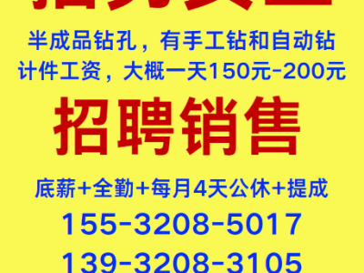 邯郸市瑞涛紧公司招聘男女工:半成品钻孔,有手工钻和自动钻,计件工资,大概一天150元——200元。另招销售:底薪+全勤+每月4天公休+提成,