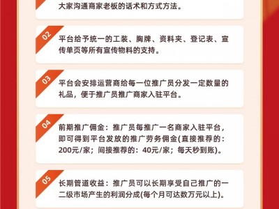 2.工资收入:每入驻一户商家,奖励推广员200元,秒到账,推广员与商家关系终身锁定,产生交易后享受长期管道收益。
