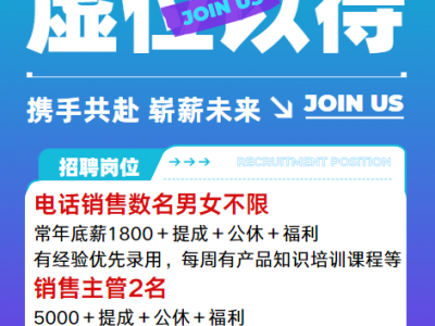 招聘电话销售数名男女不限,常年底薪1800+提成+公休+福利,有经验优先录用,每周有产品知识培训课程等,