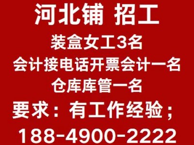 河北铺 招工:装盒女工3名,会计接电话开票会计一名,仓库库管一名,