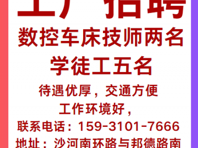 工厂招聘:数控车床技师两名,学徒工五名,待遇优厚,交通方便,工作环境好,