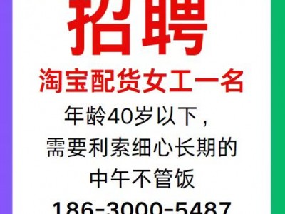 淘宝配货女工一名,年龄40岁以下,需要利索细心长期的,中午不管饭