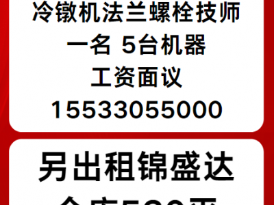 招聘冷镦机法兰螺栓技师一名,5台机器。