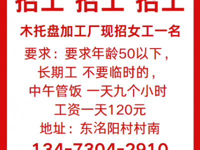 木托盘加工厂现招女工一名;