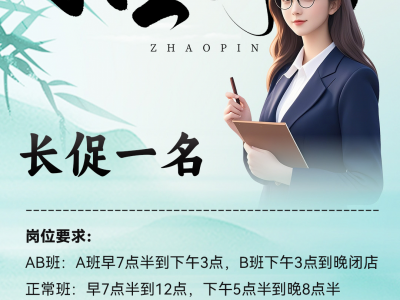 美食林永年店招长促一名,AB班,A班早7点半到下午3点,B班下午3点到晚闭店,正常班早8点到12点,下午5点到晚8点半