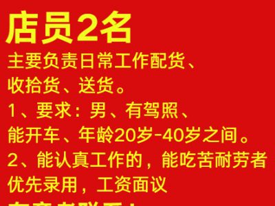 银川宁东五金店招能长期工作的店员2名,主要负责日常工作配货、收拾货、送货。