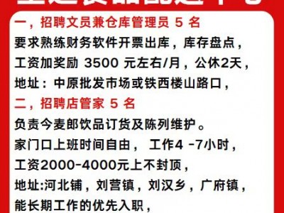 二, 招聘店管家5 名, 负责今麦郎饮品订货及陈列维护。家门口上班时间自由, 工作4 -7小时, 工资2000-4000元上不封顶,地址:河北铺,刘营镇,刘汉乡,广府镇,能长期工作的优先入职,