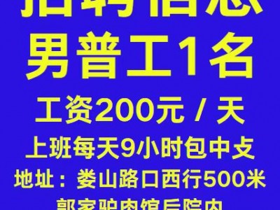 招聘:男普工1名,工资200元/天,上班每天9小时包中攴,地址:娄山路口西行500米郭家驴肉馆后院内,