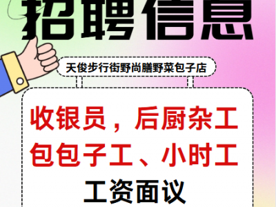天俊步行街野尚膳野菜包子店招:收银员,后厨杂工、包包子工、小时工、工资面议