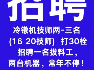 招聘冷镦机技师两-三名 (16 20技师) 打30栓, 招聘一名拔料工, 两台机器,常年不停!