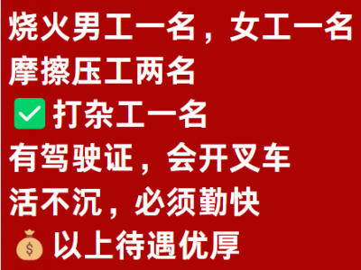 ✅招滚丝工人3名,数控车床倒角工两名,烧火男工一名,女工一名.摩擦压工两名