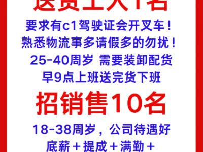 招聘送货工人1名,要求有c1驾驶证会开叉车!熟悉物流事多请假多的勿扰!25-40周岁需要装卸配货早9点上班送完货下班