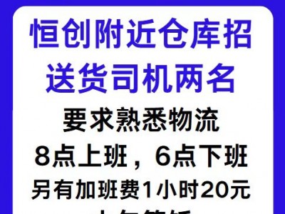 招工:恒创附近仓库招送货司机两名,要求熟悉物流 ,8点上班,6点下班,另有加班费1小时20元,中午管饭