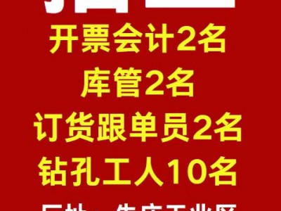 招工:开票会计2名,库管2名,订货跟单员2名,钻孔工人10名