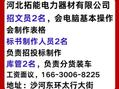 河北拓能电力器材有限公司招文员2名,会电脑基本操作会制作表格。标书制作人员2名,负责招投标制作。库管2名,负责分货装车。