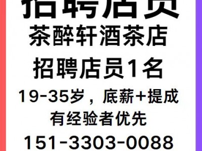 茶醉轩酒茶店招聘女店员1名,19-35岁,