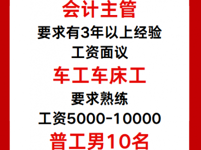 招聘:会计主管,要求有3年以上经验。工资面议 车工车床工,要求熟练工资5000-10000