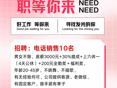电话销售10名:男女不限,底薪3000元+30%提成+上六休一(4天公休)+200元全勤奖+福利奖,年龄20-45岁,不跳舞,不唱歌,有无经验均可,公司提供客源、老微信,有固定客户,接手就有单子