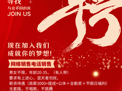 诚招网络销售电话销售,男女不限,年龄20-35,(有人带)要求有上进心,混天者勿扰,薪资待遇(底薪3000+提成+公休+全勤奖+节假日福利)无套路,不唱歌,不跳舞。办公地址:新商城二区二栋三号