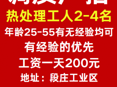 调质厂招热处理工人2-4名,年龄25-55有无经验均可,