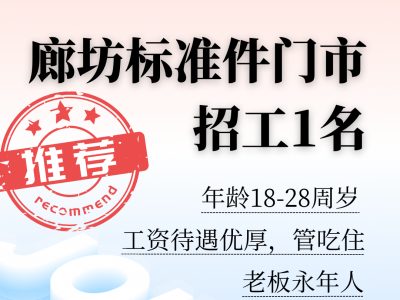 廊坊标准件门市招工1名,年龄18-28周岁,工资待遇优厚,管吃住,老板永年人,混天勿扰,