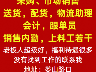 招聘采购、市场销售、 送货,配货,物流助理, 会计,跟单员,销售内勤,上料工若干名,老板人超级好,福利待遇很多,没有找到工作的联系我,地址:娄山路口致富热线: 15133076303,19030603002