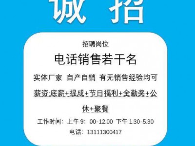 电话销售若干名实体厂家 自产自销 有无销售经验均可薪资:底薪+提成+节日福利+全勤奖+公休+聚餐