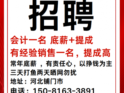 招聘,招聘会计一名 底薪+提成;有经验销售一名,提成高,常年底薪 ,
