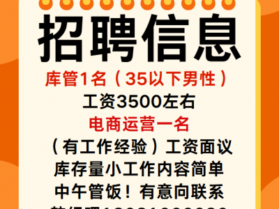 招聘:库管1名(35以下男性),工资3500左右,电商运营一名(有工作经验)工资面议。库存量小工作内容简单,中午管饭!