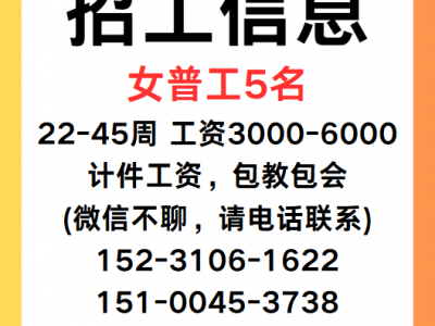 女普工5名 22-45周 工资3000-6000