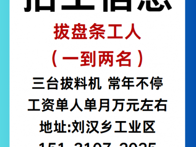现招:拔盘条工人(一到两名)三台拔料机,常年不停,工资单人单月万元左右