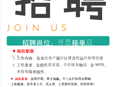 邯郸市永年区超睿紧固件有限公司招聘文员,工作内容:负责给客户报价计算含税运价格等促单 工作要求:会操作管家婆,手机联系物流,会WPS,表格等简单操作。 岗位要求:活泼开朗、善于沟通,不三天打鱼两天晒网。 招聘热线: 地址:中原套筒|河北省邯郸市永年区中国国际标准件产业城4期仓库西区1-18