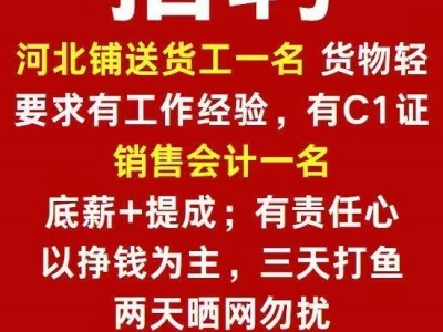 招聘河北铺送货工一名,货物轻,要求有工作经验,有C1证,销售会计一名,底薪+提成;有责任心,以挣钱为主,三天打鱼两天晒网勿扰,