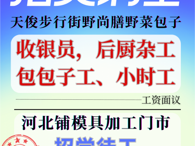 天俊步行街野尚膳野菜包子店招:收银员,后厨杂工、包包子工、小时工、工资面议