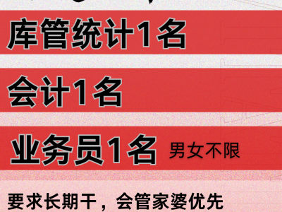 库管统计1名,会计1名,业务员1名,男女不限