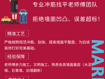 房屋室内装修专业冲筋找平施工老师傅手艺,墙面平整一步到位!专业冲筋找平老师傅团队,多年施工经验,拒绝墙面凹凸、 高效省心上门勘测、定制施工方案,完工即清场,让您装修少走弯路。墙面要平整,找对师傅是关键!