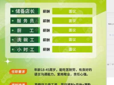 招聘:储备店长,厨工 ,洗碗工,小时工,服务员 任职要求: 年龄18-45周岁,能吃苦耐劳,有良好的语言沟通能力,爱岗敬业,责任心强。 福利待遇: 节假日三倍工资,节日福利+月休+满勤 地址:咏乡园过桥米线(政府街二店)|河北省邯郸市永年区临洺关镇政府街与洺兴路交叉口东80米路南(中国建设银行西侧)
