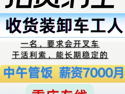 世创物流招 收货装卸车工人一名,要求会开叉车干活利索,要能长期稳定的,中午管饭,薪资7000月 重庆专线