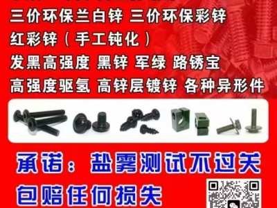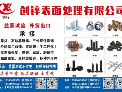 创锌表面处理有限公司H5-4-3A,承接:高盐雾试验,三价环保彩锌/蓝白锌,高强度紧固件镀锌(8.8级/10.9级/12.9级),手摇彩锌钝化,黑锌,军绿,零货。(不伤扣)