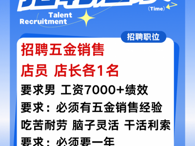 招聘五金销售 店员 店长各1名