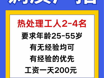 调质厂招热处理工人2-4名,年龄25-55,有无经验均可,