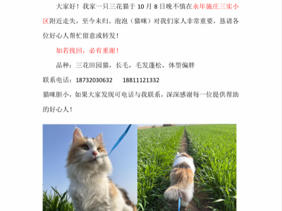 寻猫启示,我家一只三花长毛猫10月8日在施庄走失,麻烦看到跟本人联系