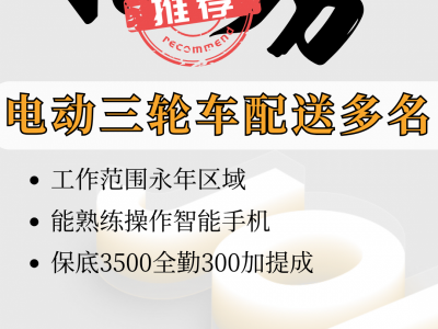 招聘电动三轮车配送多名,工作范围永年区域,能熟练操作智能手机,保底3500全勤300加提成