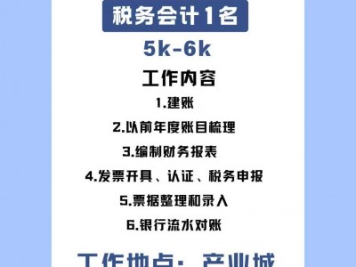 建材类商贸公司招税务会计1名工资:5000-6000/月每周休1天工作地点:产业城
