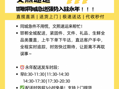 邯郸全城配送,紧固件、文件、礼品、生鲜全品类覆盖,上午下单下午达,直达客户手中,全程实时追踪,时效快过期待,让距离不再耽误事~