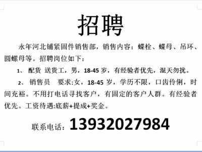 要求:女,18-45岁,学历不限,口齿伶俐,时间充裕。不用打电话寻找客户,有固定的客户人群。有经验者优先。工资待遇:底薪+提成+奖金。