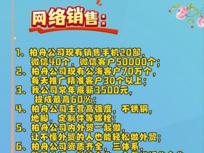 招聘销售 网络销售:1、柏舟公司现有销售手机20部,微信40个,微信客户50000个;2、柏舟公司现有公海客户70万个,每天推广精准客户30个以上;3、我公司常年底薪3500元,提成最高60%;具体可面试详谈4、柏舟公司主营高强度,不锈钢,地脚,定制件等螺栓;5、柏舟公司内外贸一起做,让不懂外贸的人也能轻松做外贸;6、柏舟公司资质齐全,三体系,欧盟认证,科技企业,永年样板化企业;7、柏舟公司是真正的女排世界冠军代言品牌,政府背书,开单容易,是真正的实体厂家!上班时间8:30-12:0013:30-18:00周日单休 地址:东滩头村|河北省邯郸市永年区临洺关镇
