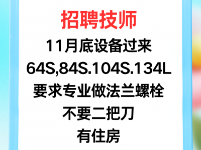 招聘技师:11月底设备过来64S,84S.104S.134L,招技师:要求专业做法兰螺栓,不要二把刀,有住房,工资面议。