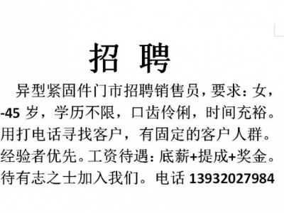 要求:女,18-45岁,学历不限,口齿伶俐,时间充裕。不用打电话寻找客户,有固定的客户人群。有经验者优先。工资待遇:底薪+提成+奖金。