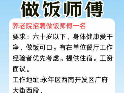 养老院招聘厨师一名,要求六十岁以下,身体健康爱干净,做饭可口。有在单位餐厅工作经验者优先考虑。提供住宿。工资面议。